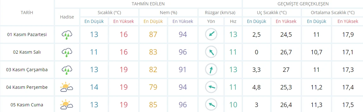 Yağışların; Antalya, Isparta, Aydın, Muğla, Tunceli, Muş, Bingöl çevreleri ile Diyarbakır’ın doğusunda yerel olarak kuvvetli olması beklendiğinden meydana gelebilecek olumsuzluklara karşı (sel, su baskını, ulaşımda aksamalar, vb) dikkatli ve tedbirli olunması gerekmektedir. İşte 1 Kasım Pazartesi illere göre hava durumu ve İstanbul 5 günlük hava durumu...