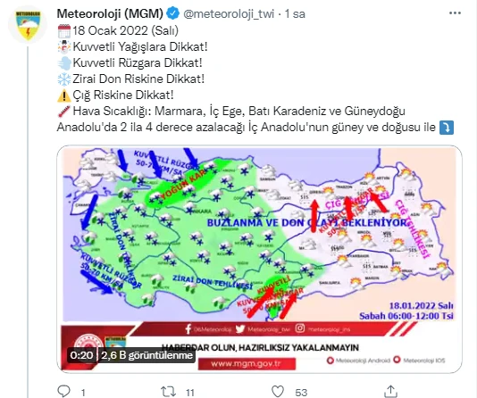 Meteoroloji Genel Müdürlüğü tarafından 18 Ocak 2022 tarihli hava durumu raporu yayımlandı. Sıcaklıklar ülke genelinde mevsim normallerinin altında seyredecek. Ülke genelinde parçalı ve çok bulutlu bir hava hakim olacak.
