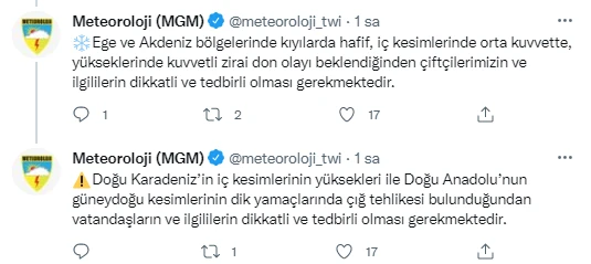 Doğu Karadeniz'in iç kesimlerinin yüksekleri ile Doğu Anadolu'nun güneydoğu kesimlerinin dik yamaçlarında çığ tehlikesi bulunduğu aktarıldı. Kuzey, iç ve doğu kesimlerde buzlanma ve don olayı ile birlikte yer yer pus ve sis görüleceği tahmin ediliyor.