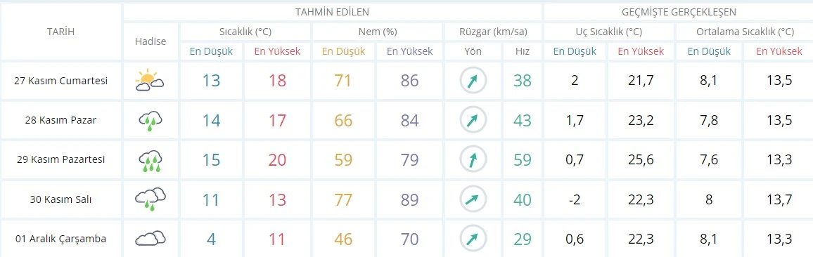 Marmara, Ege, Batı Akdeniz’in iç kesimleri, İç Anadolu'nun batısı ile Batı ve Orta Karadeniz’in iç kesimlerinde güney ve güneybatı yönlerden kuvvetli ve yer yer kısa süreli fırtına (40-70 km/sa) şeklinde esmesi beklendiğinden yaşanabilecek olumsuz şartlara karşı ulaşımda aksamalar, Çatı Uçması gibi dikkatli ve tedbirli olunmalıdır. İşte 27 Kasım illere göre hava durumu...