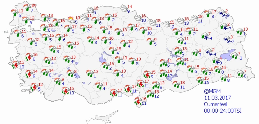 Ülke genelinin parçalı ve çok bulutlu, Orta ve Doğu Karadeniz kıyıları ile Kastamonu kıyıları, Bartın ve Sinop çevreleri dışında kalan bütün bölgelerin yağışlı geçeceği tahmin ediliyor. Yağışların; genellikle yağmur ve sağanak, yer yer gök gürültülü sağanak, Doğu Karadeniz’in iç kesimleri ile Doğu Anadolu’nun kuzey ve doğusunda karla karışık yağmur ve yükseklerinde yer yer kar şeklinde olması bekleniyor. Yağışların Doğu Akdeniz ile Muğla kıyıları, Antalya, Isparta’nın güneyi, Malatya, Elazığ ve Adıyaman çevrelerinde yer yer kuvvetli olması bekleniyor. Bu sabah ve gece saatlerinde iç ve doğu kesimlerde yer yer sis ve pus hadisesi ile birlikte Doğu Anadolu’nun kuzey ve doğusunda buzlanma ve don olayı bekleniyor.