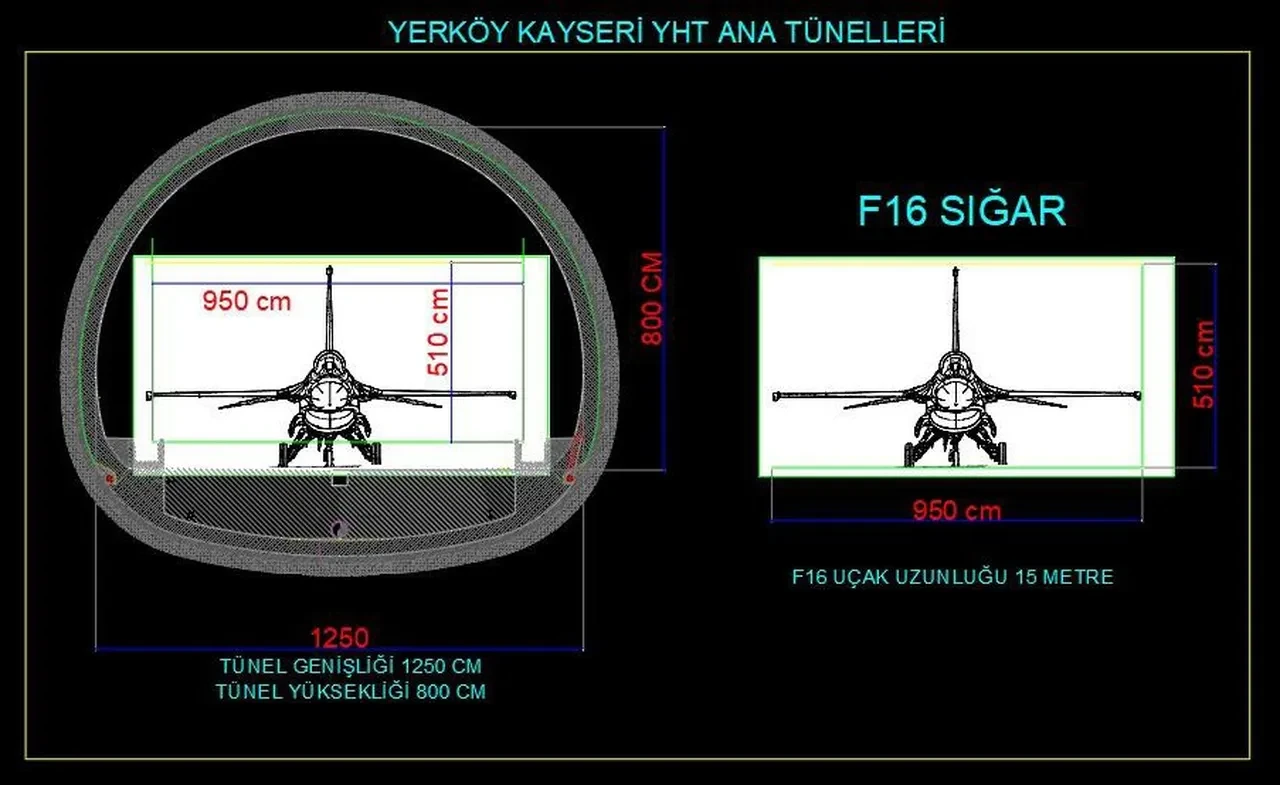 Faydalı genişliği 12,5 metre, yüksekliği 8 metre olan çift hatlı demir yolu tünellerimiz, iki M60 tankın yan yana geçişine imkan tanıyan, hatta bir F-16 uçağının sığabileceği kadar geniş hacme sahiptir." ifadesini kullandı.