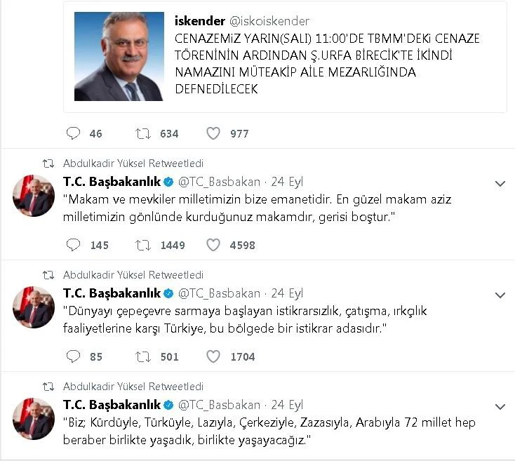 Ankara'da dün gece geçirdiği kalp krizi sonrası kaldırıldığı hastanede vefat eden AK Parti Gaziantep Milletvekili Abdülkadir Yüksel'in sosyal medya hesabından yaptığı son paylaşımı, Başbakan Binali Yıldırım'ın televizyon kanalların ortak canlı yayınında söylediği makam ve mevkiler ile ilgili söylemleri oldu. Yüksel'in 24 Eylül tarihinde yaptığı son iki paylaşımında, "Makam ve mevkiler milletimizin bize emanetidir. En güzel makam aziz milletimizin gönlünde kurduğunuz makamdır, gerisi boştur. Dünyayı çepeçevre sarmaya başlayan istikrarsızlık, çatışma, ırkçılık faaliyetlerine karşı Türkiye, bu bölgede bir istikrar adasıdır" ifadeleri yer aldı.