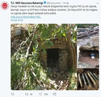 Milli Savunma Bakanlığı'ndan yapılan son dakika açıklamasında, "Pençe Harekâtı ile Irak kuzeyi Hakurk bölgesinde terör örgütü PKK'ya ait sığınak, barınak, mayın ve EYP'lerin imhası aralıksız sürerken, 24 Mayın/EYP ile 26 mağara ve sığınak daha tespit edilerek imha edildi." denildi.