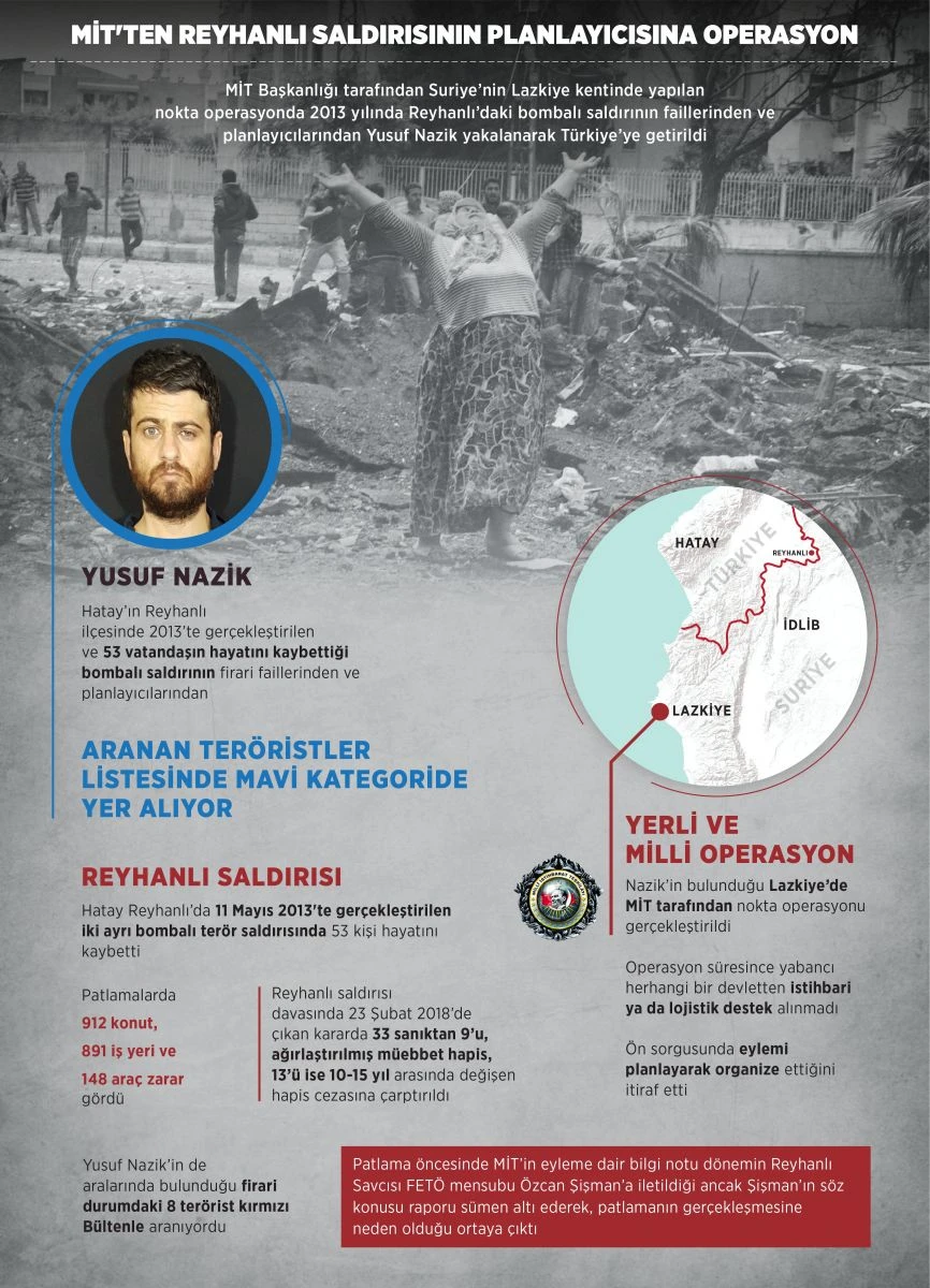 Edinilen bilgiye göre, Hatay’ın Reyhanlı ilçesinde 2013’te gerçekleştirilen ve 53 vatandaşın hayatını kaybettiği bombalı saldırıda failleri yönlendiren ve Suriye istihbaratıyla irtibatı sağlayan Yusuf Nazik’in bulunduğu Suriye'nin Lazkiye kentinde MİT tarafından nokta operasyonu gerçekleştirildi.