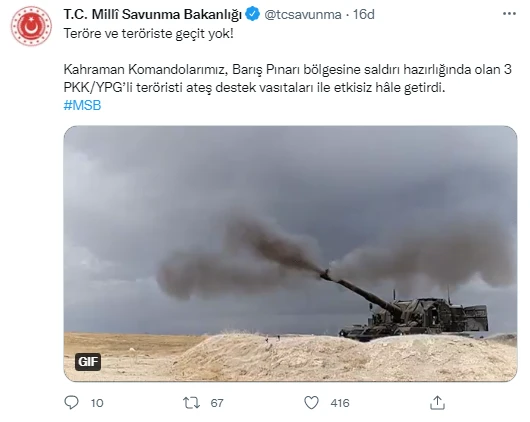 Milli Savunma Bakanlığı (MSB) sosyal medya platformu Twitter'dan yapılan paylaşımda, Barış Pınarı bölgesine saldırı hazırlığında olan 3 PKK/YPG’li teröristin öldürüldüğü duyuruldu.