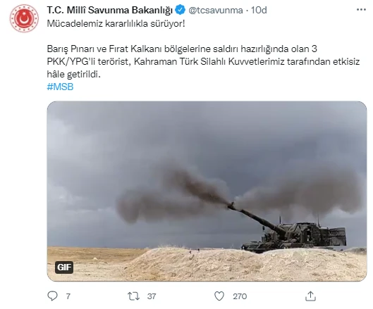 MSB'den yapılan açıklamada, "Barış Pınarı ve Fırat Kalkanı bölgelerine saldırı hazırlığında olan 3 PKK/YPG'li terörist, Kahraman Türk Silahlı Kuvvetlerimiz tarafından etkisiz hâle getirildi" denildi.
