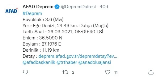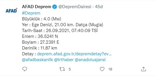 T.C. İçişleri Bakanlığı Afet ve Acil Durum Yönetimi Başkanlığı (AFAD) yetkilileri, resmi internet sitesi ve sosyal medya hesapları üzerinden yatıkları açıklamada, Ege Bölgesi'nin güne depremle başladığını duyurdu. İlki saat 07.40'ta gerçekleşen sarsıntının büyüklüğü ise 4,0 olarak ölçüldü. Depremin derinliği ise 11,87 km olarak ölçülürken bölgede henüz olumsuz bir ihbar yapılmadı.