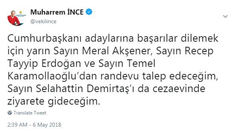 Muharrem ince sosyal medya hesabından yaptığı açıklamada şu ifadeleri kullandı: Cumhurbaşkanı adaylarına başarılar dilemek için yarın Sayın Meral Akşener, Sayın Recep Tayyip Erdoğan ve Sayın Temel Karamollaoğlu’dan randevu talep edeceğim, Sayın Selahattin Demirtaş’ı da cezaevinde ziyarete gideceğim.