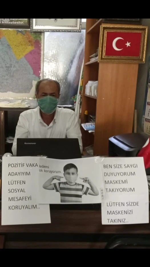 Muhtar Yiğit, vaka sayılarının artması üzerine Covıd-19 salgın hastalığına daha duyarlı olunması için muhtarlık bürosuna ilginç uyarı ilanları asarak dikkat çekmek istediğine parmak basıp, dikkat çeken uyarı yazılarında şu ifadeler yer aldı: ''Ben Size Saygı Duyuyorum Maskemi Takıyorum. Lütfen Sizde Maskenizi Takınız.”, '' Ben Pozitif Vaka Adayıyım, Lütfen Mesafemizi koruyalım'', ''Pozitif Vaka Sonucu Vefat Eden Çok Sevdiğim Yakınımın Cenazesini Sadece Uzaktan Seyredebildim'', “ ' Darılmak Yok Sağlığımız İçin Bir Süreliğine Tokalaşmıyoruz''