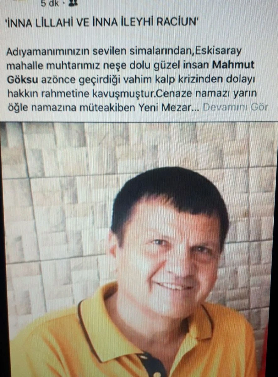 Kimliği belirsiz birkaç kişi tarafından sosyal medyadan ‘Eskisaray Mahalle Muhtarı Mahmut Göksu geçirdiği kalp krizi sonucu ölmüştür’ şeklinde paylaşımların yapılması üzerine öldü haberini görenler Muhtar Mahmut Göksu’yu aramaya başladı. Bazı vatandaşlar Muhtar Göksu’nun evine, bazı vatandaşlar ise muhtarlık bürosuna giderek baş sağlığı dileklerinde bulunmak istedi. Baş sağlığına giden vatandaşlar, karşılarında Muhtar Göksu’yu görmeleriyle büyük bir şaşkınlık ile mutluluk yaşadı.
