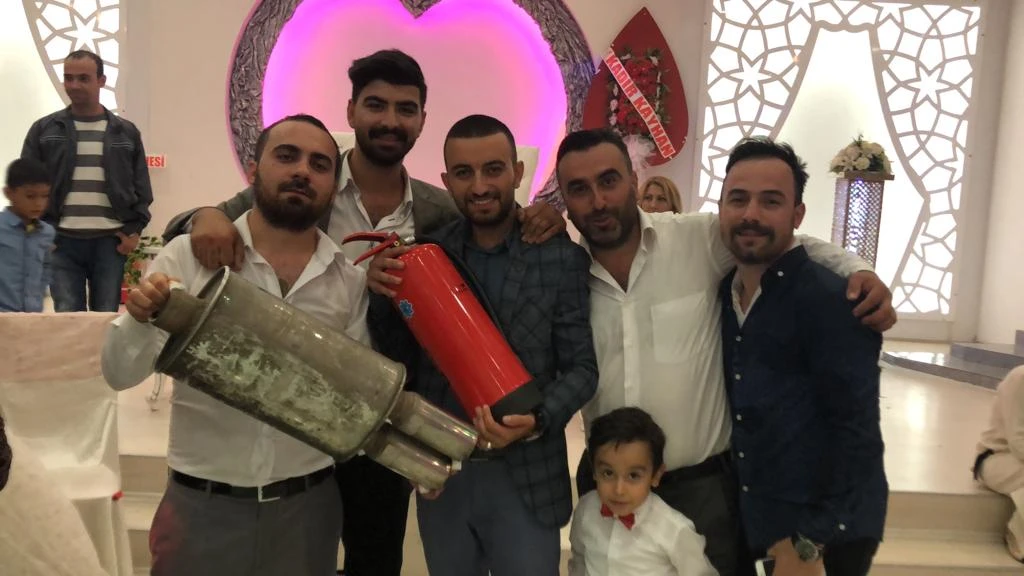 Durum karşısında şaşkına dönen damat Onur Turgut, "Hiç böyle bir hediye beklemiyordum. Ahmet abimize yangın tüpü taktıklarında ben de vardım. Ama bana böyle bir hediye vereceklerini beklemiyordum. Egzozu arabama taktıracağım. Çok teşekkür ediyorum" dedi.