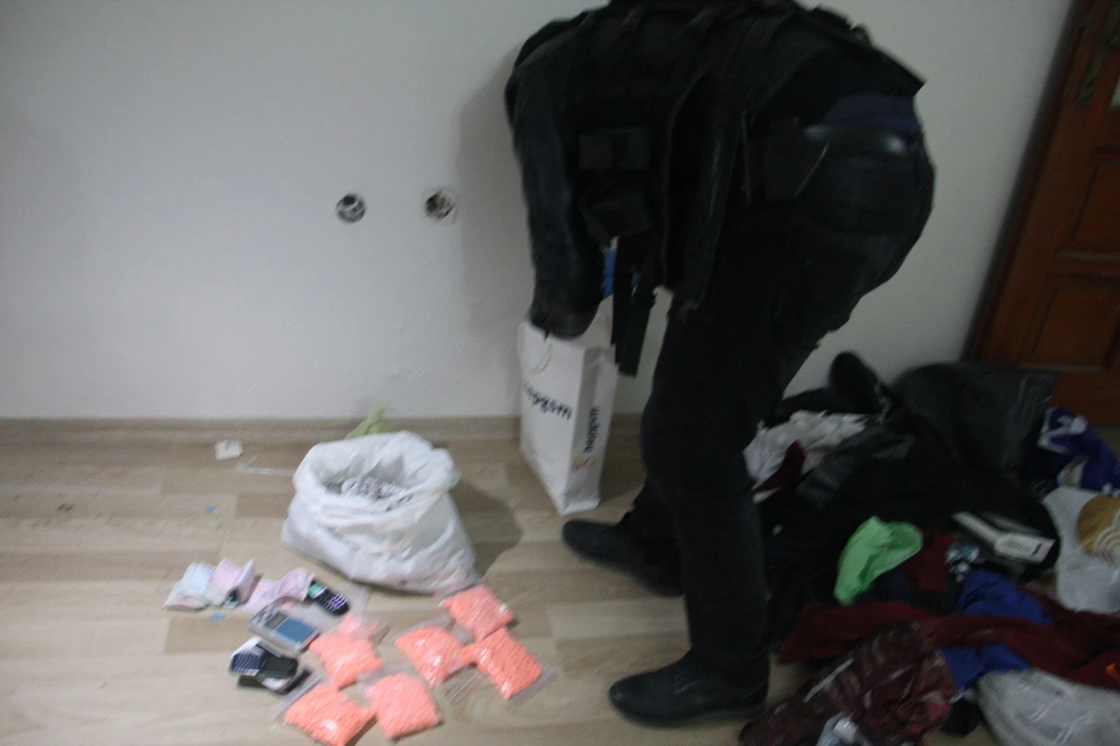 Cumhuriyet Mahallesi Nergis Sokakta bulunan ve daha önceden belirlenen adrese ekipler kapıyı kırarak girdi. Evin içerisinde arama yapan ekipler bir oyunca ayı buldu. Oyuncak ayıda inceleme yapan ekipler çok sayıda sentetik uyuşturucu hap ele geçirdi. Evi komple arayan ekipler evin içerisinde kokain, esrar maddesi, para ve 3 tane cep telefonu buldu. Evlerdeki aramalarını tamamlayan ekipler şüphelileri gözaltına aldı.