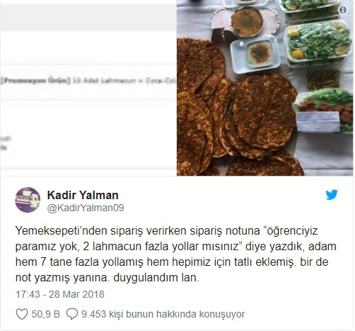 Bir restorandan lahmacun siparişi veren Yalman, sipariş notuna da “ Merhaba, evde 5 öğrenciyiz. Vize haftası başladı, neredeyse uyumadan sınavlara çalışıyoruz. Kişi başı 3 lahmacun sipariş edecektik ama paramız bu kadarına yetti (bursun yatmasına daha çok var), mümkünse 2 tane daha rica ediyoruz” ifadelerini ekledi.