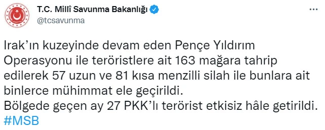 "Irak’ın kuzeyinde devam eden Pençe Yıldırım Operasyonu ile teröristlere ait 163 mağara tahrip edilerek 57 uzun ve 81 kısa menzilli silah ile bunlara ait binlerce mühimmat ele geçirildi. Bölgede geçen ay 27 PKK’lı terörist etkisiz hâle getirildi" denildi.
