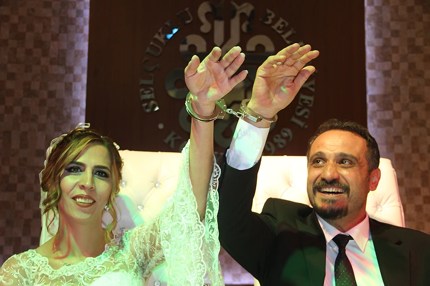 Tören için Selçuklu Belediyesi Nikah Salonu önüne gelen Öznur Ün, nişanlısı Muhammet Yıldız'a girişte ters kelepçe taktı.