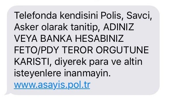 Polis ise vatandaşlara, "Kendilerini polis, savcı ve asker olarak tanıtan ve 'Adınız ya da banka hesabınız FETÖ/PDY terör örgütüne karıştı' diye kandırarak altın ile para isteyenlere inanmayın" yazılı SMS gönderdi.