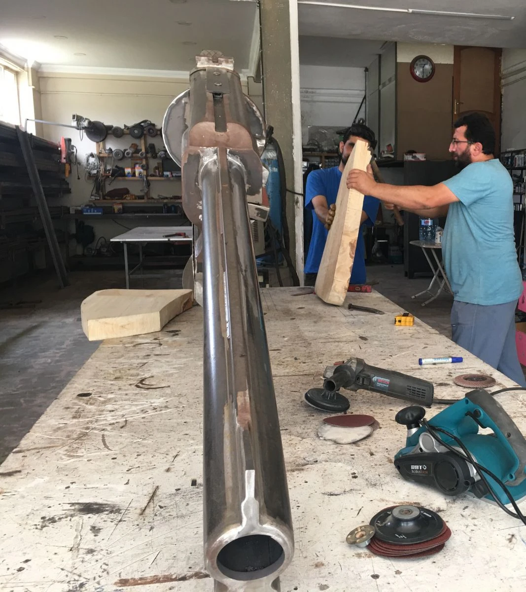 Demirden üretilen dev silahın yapımının yaklaşık 1 buçuk ay sürdüğünü söyleyen Zafer, “Özellikle çalışma mekanizmasında teferruatları var. Tetik tertinatı, dönen top ve horozun senkronize, birbirinden saniyeler içinde ayrı ayrı çalışması lazım. Ses fişeği patlatmayı düşünüyorum ileride. Aşağı yukarı 100 kiloya yakın” ifadelerini kullandı.