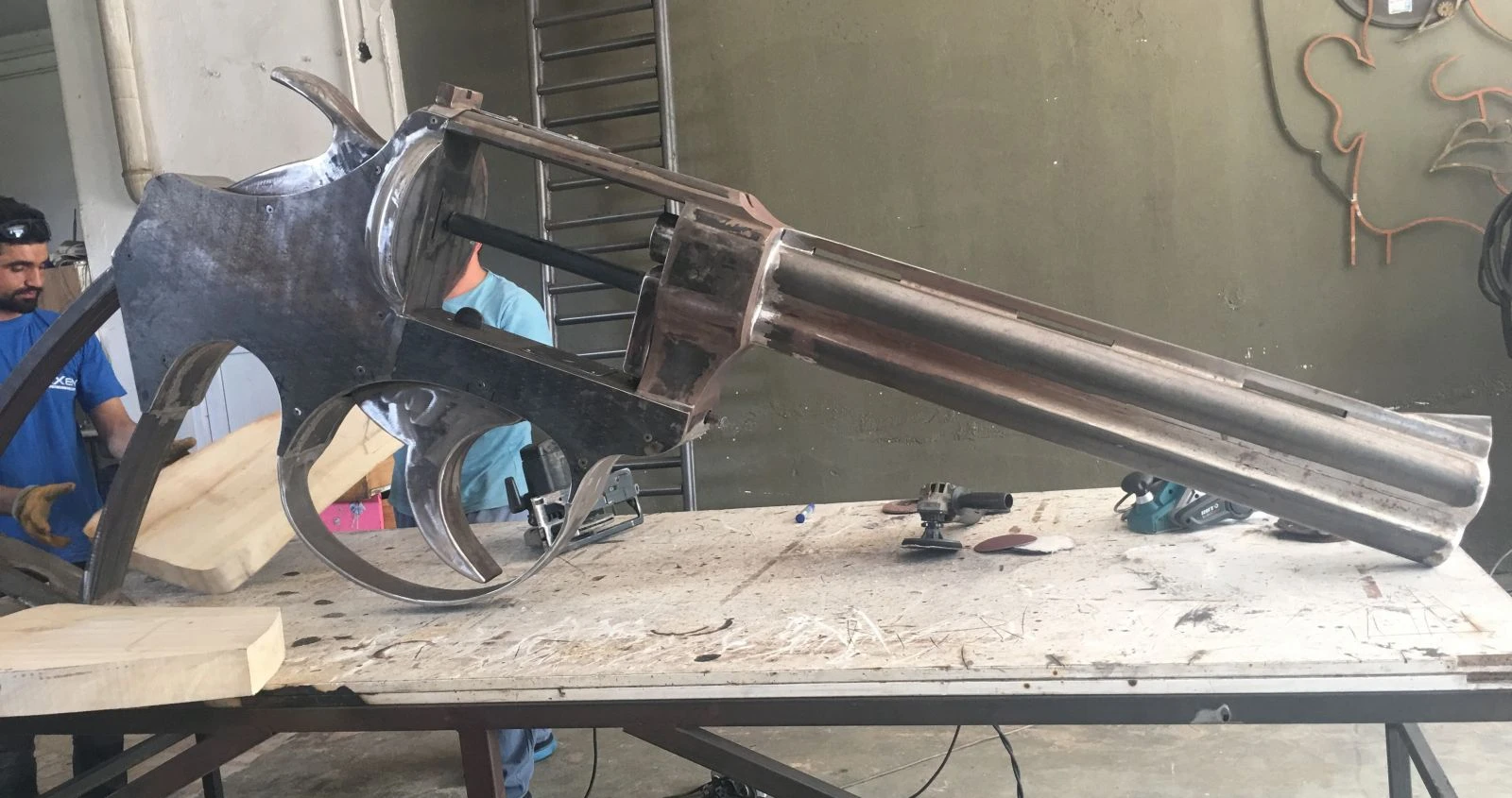 Rizeli kinetik heykel ustası Zafer Erdem, devasa büyüklükte altıpatlar olarak bilinen silah yaptı. Erdem’in yaptığı dev silah vatandaşlar tarafından yoğun ilgi gördü.