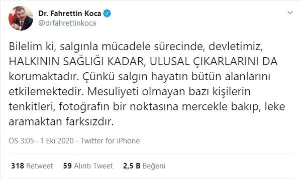Bilelim ki, salgınla mücadele sürecinde, devletimiz, HALKININ SAĞLIĞI KADAR, ULUSAL ÇIKARLARINI DA korumaktadır. Çünkü salgın hayatın bütün alanlarını etkilemektedir. Mesuliyeti olmayan bazı kişilerin tenkitleri, fotoğrafın bir noktasına mercekle bakıp, leke aramaktan farksızdır.