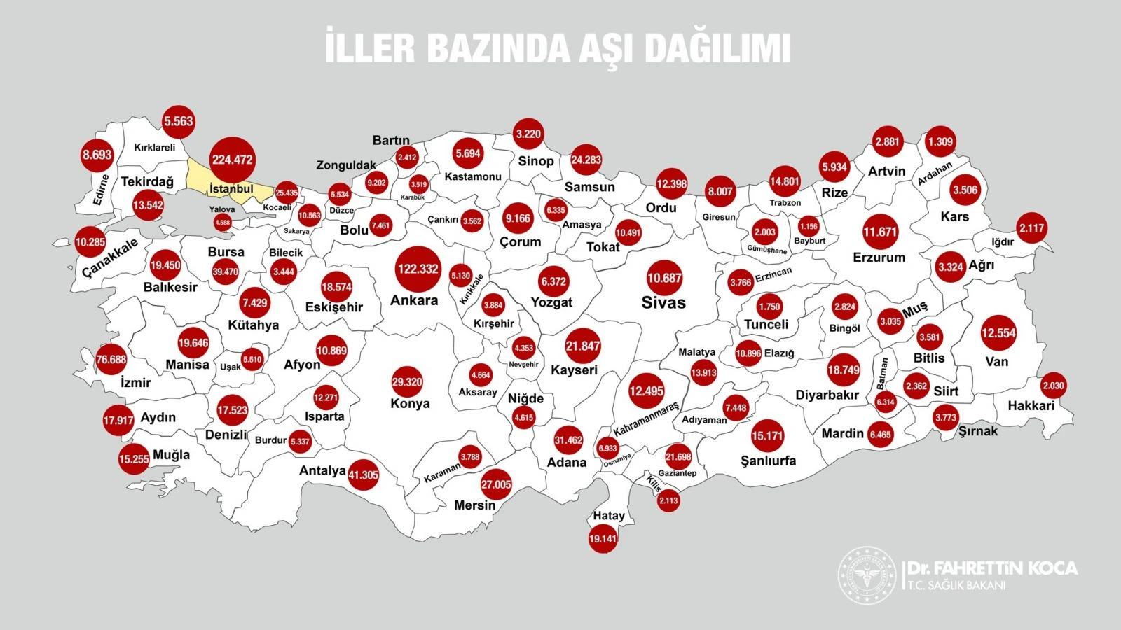 Sağlık Bakanı Fahrettin Koca, sosyal paylaşım sitesi Twitter üzerinden yaptığı paylaşımda, “1 milyon 200 binden fazla kişi şu ana kadar aşı oldu. Türkiye’de iller bazında aşı dağılımını görebilirsiniz. Pazartesi gününden itibaren bunu canlı olarak takip edebileceksiniz. En çok sağlık çalışanımızın bulunduğu İstanbul’da 224.000’den fazla kişi aşı oldu” ifadelerini kullandı. Bakan Koca ayrıca paylaşımına Türkiye’deki Covid-19 aşılama haritasını da ekledi.