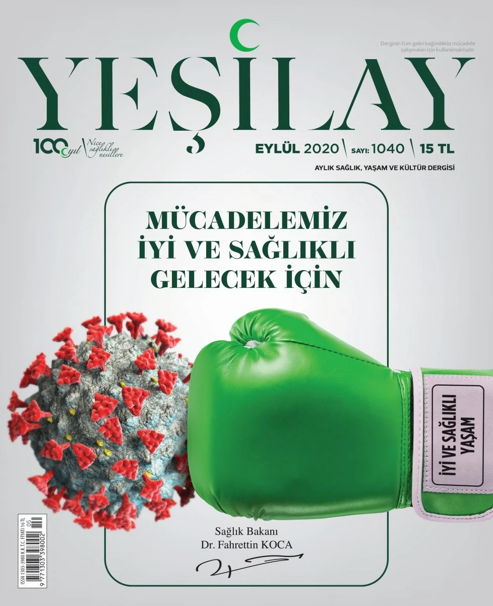 Yeşilay Dergisi’nin Eylül sayısı kapağını, Sağlık Bakanı Dr. Fahrettin Koca tasarladı. Tasarımında iyi ve sağlıklı yaşamın koronavirüsle mücadelede en önemli güç olduğuna dikkat çeken Dr. Fahrettin Koca, kapakta “Mücadelemiz iyi ve sağlıklı gelecek için” sloganına yer verdi.