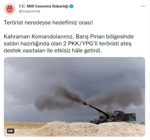 "Kahraman Komandolarımız, Barış Pınarı bölgesinde saldırı hazırlığında olan 2 PKK/YPG’li teröristi ateş destek vasıtaları ile etkisiz hâle getirdi."