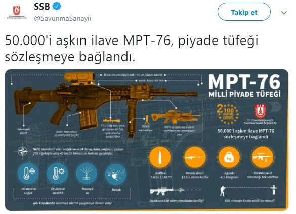 SSB, Twitter hesabından "50.000'i aşkın ilave MPT-76, piyade tüfeği sözleşmeye bağlandı." açıklamasıyla sözleşmeyi duyurdu. Savunma Sanayii Başkanı İsmail Demir, paylaşımı alıntılayarak "MPT-76'ya ek olarak farklı sınıf ve özelliklerdeki tüfekler yönelik çalışmalarımız devam ediyor." açıklamasında bulundu.