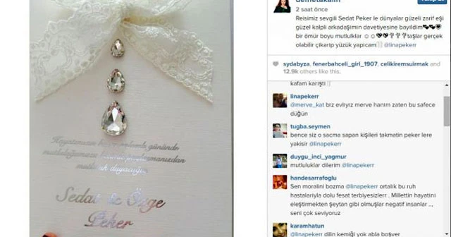 Çiftin davetiyesini ünlü şarkıcı Demet Akalın Instagram hesabından paylaştı. Akalın fotoğrafın altına, 'Reisimiz sevgili Sedat Peker ile dünyalar güzeli zarif eşi güzel kalpli arkadaşımın davetiyesine bayıldım. bir ömür boyu mutluluklar. Taşlar gerçek olabilir çıkarıp yüzük yapıcam' notuyla takipçileriyle paylaştı. yazdı.