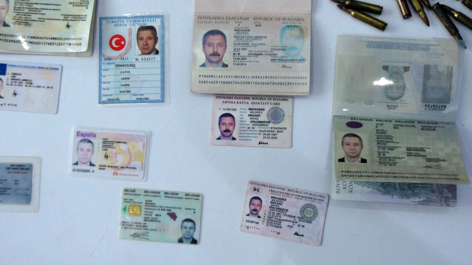 Belçika, Bulgaristan ve İspanya’ya ait başka şahıslar üzerine düzenlenmiş pasaport, AB ülkelerine ait çeşitli şahıslar üzerine düzenlenen kimlikler ile sahte nüfuz cüzdanlarının da ele geçirildiği operasyonlarda, el konulan silahlar ise şöyle; 2 Lav silahı, 10'u Kaleşnikof marka biri M4 marka otomatik tüfek, 1 Thomson marka otomatik silah, 19 tabanca, 4 el bombası ve bu silahlara ait 3 bin 900 adet mermi.