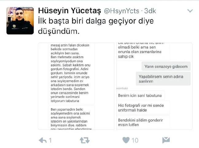 Şehidin ev arkadaşı ve meslektaşı Hüseyin Yücetaş bu yazışmaları "İlk başta biri dalga geçiyor diye düşündüm" ifadeleriyle paylaştı.