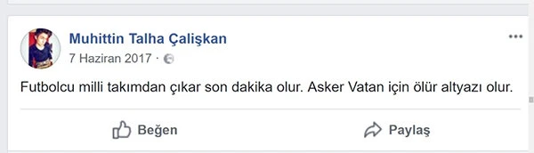 Şehit Çalışkan’ın, sosyal medyadaki hesabından yaptığı bir paylaşımda, ’Futbolcu milli takımdan çıkar son dakika olur, asker vatan için ölür altyazı olur’ yazdığı görüldü.