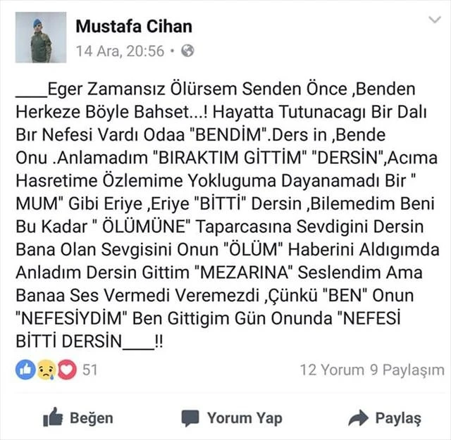 Şehit onbaşı, 'facebook' hesabından şu dizeleri paylaştı "Eğer zamansız ölürsem senden önce benden herkese böyle bahset Hayatta tutunacağı bir dalı bir nefesi vardı o da bendim dersin. Bende onu anlamadım.Bıraktım gittim dersin.Acıma hasretime özlemime yokluğuma dayanamadı,bir mum gibi eriye eriye bitti dersin. Bilemedim beni bu kadar ölümüne taparcasına sevdiğini dersin.Bana olan sevgisini onun ölüm haberini aldığımda anladım dersin. Gittim mezarına seslendim ama bana ses vermedi veremezdi çünkü ben onun nefesiydim. Ben gittiğim gün onun da nefesi bitti dersin".