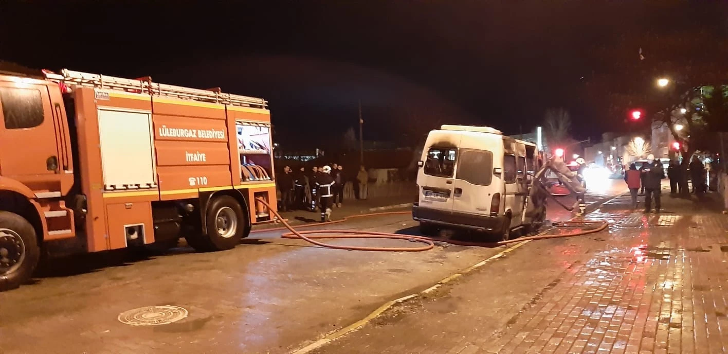 Olay Kırklareli’nin Lüleburgaz İlçesine bağlı Pazaryerinde meydana geldi. Henüz bilinmeyen bir nedenle seyir halinde olan 39 LB 470 plakalı minibüste yangın çıktı. Rüzgarın etkisi ile alev topuna dönen minibüsün sürücüsü can havliyle araçtan inerek yangını kendi imkanlarıyla söndürmeye çalıştı.
