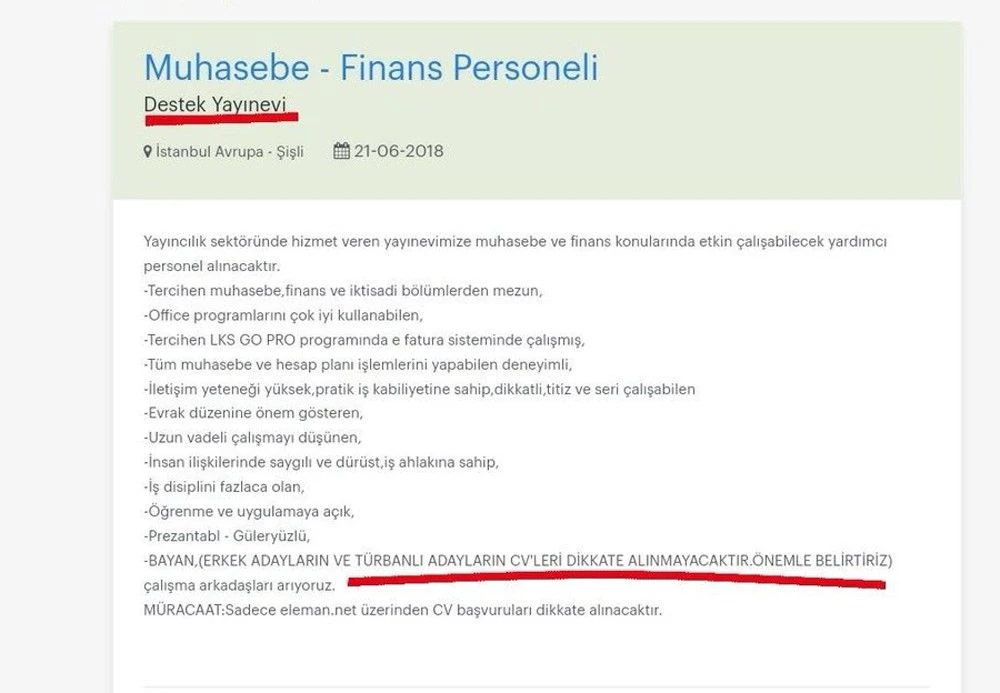 Destek Yayınlarının bir internet sitesinde yer alan ‘muhasebe personeli’ ilanında başörtülülere yönelik skandal bir ayrımcılık yapıldı. İlanda, “Türbanlı adayların başvuruları dikkate alınmayacaktır” denildi.