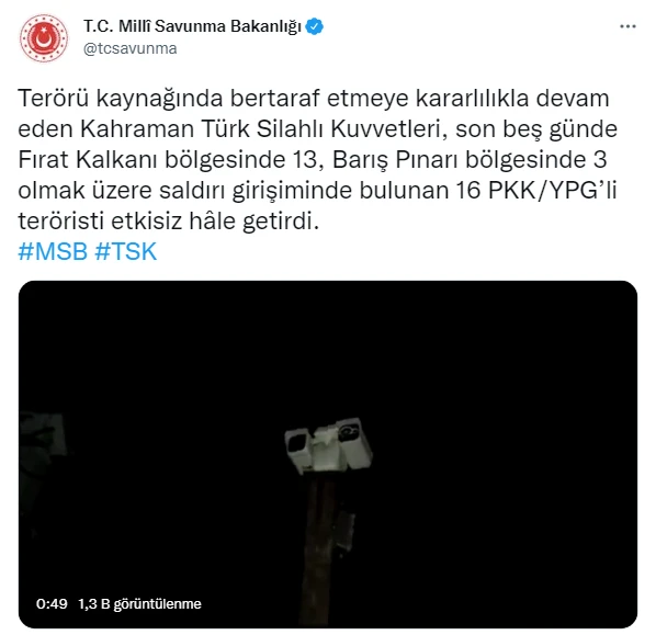 "Terörü kaynağında bertaraf etmeye kararlılıkla devam eden Kahraman Türk Silahlı Kuvvetleri, son beş günde Fırat Kalkanı bölgesinde 13, Barış Pınarı bölgesinde 3 olmak üzere saldırı girişiminde bulunan 16 PKK/YPG’li teröristi etkisiz hâle getirdi."