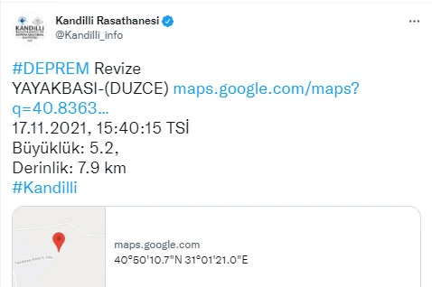 Marmara'da meydana gelen depremin merkez üssünü AFAD ve Kandilli Düzce olarak açıkladı. 5.2 büyüklüğündeki meydana gelen depremi İstanbul başta olmak üzere birçok il hissetti. Depremin herhangi bir can ve mal kaybına yol açmadığı yetkililer tarafından yapılan açıklamada bildirildi. Depremden dakikalar sonra 4.3 şiddetinde meydana gelen artçı depremle Düzce bir kez daha sallandı.