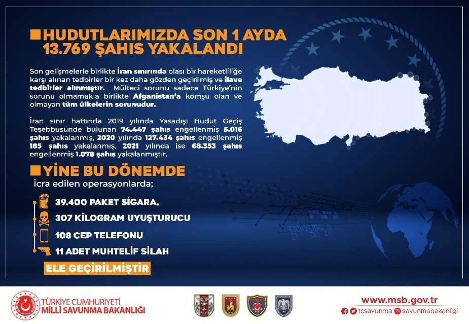 Afganistan’daki gelişmeler sonrasında İran hududundaki tedbirlerin artırıldığına dikkat çeken Kara, “İran sınır hattında 2019 yılında yasa dışı hudut geçiş teşebbüsünde bulunan 74 bin 447 şahıs engellenmiş, 5 bin 16 şahıs yakalanmış; 2020 yılında 127 bin 434 şahıs engellenmiş, 185 şahıs yakalanmış, 2021 yılında ise 68 bin 353 şahıs engellenmiş, bin 78 şahıs yakalanmıştır. Alınan ilave ve etkin tedbirler sayesinde son bir ayda tüm hudutlarımızdan yasa dışı yollarla geçmeye çalışan 13 bin 769 şahıs yakalanmış, 25 bin 186 şahıs ise hududu geçemeden engellenmiştir. Yakalanan bu şahısların 54’ü FETÖ olmak üzere toplam 75’i teröristtir. Yine bu dönemde icra edilen operasyonlarda 39 bin 400 paket sigara, 307 kilogram uyuşturucu, 108 cep telefonu ve 11 adet muhtelif silah ele geçirilmiştir. Son dönemde ele geçirilen malzemelerde özellikle elektronik malzeme ve uyuşturucuda artış olduğu gözlemlenmektedir” şeklinde konuştu.