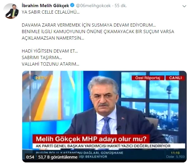 Bu açıklama sonrası gözlerin çevrildiği Gökçek kanadından zehir zemberek bir yanıt geldi. Yazıcı için "Sabrımı taşıma" ifadesini kullanan Gökçek, "Davama zarar vermemek için susmaya devam ediyorum. Benimle ilgili kamuoyunun önüne çıkamayacak bir suçum varsa açıklamazsan namertsin. Hadi yiğitsen devam et. Vallahi tozunu atarım" sözleriyle cevap verdi.