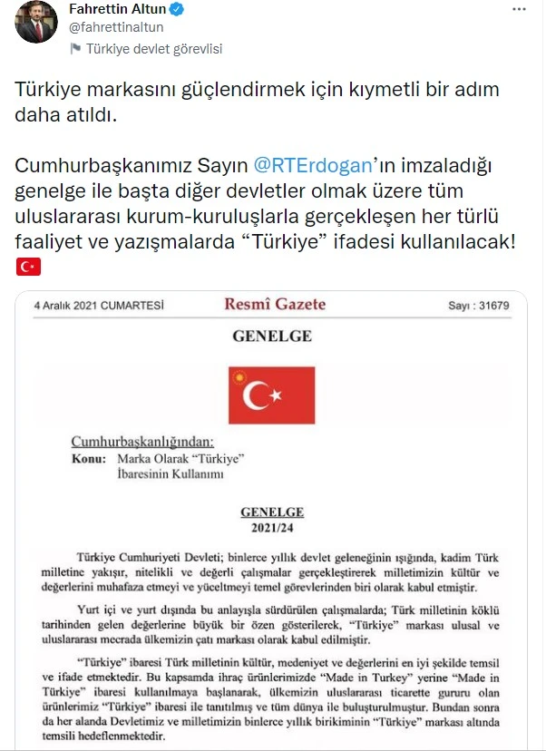Türkiye'nin ihraç ürünlerinde artık "Made in Turkey" yerine "Made in Türkiye" ibaresi kullanılacak. Resmi Gazete'de Cumhurbaşkanı Recep Tayyip Erdoğan'ın imzası ile yayımlanan Genelge'ye göre; devletler ve uluslararası kuruluşlarla olan her türlü faaliyet ve yazışmada da "Turkey", "Turkei", "Turquie" ibareleri yerine "Türkiye" ibaresi kullanılacak. Cumhurbaşkanlığı imzasıyla yayımlanan genelgenin Türkiye markasını güçlendirmek için önemli bir adım olduğunu ifade eden Cumhurbaşkanlığı İletişim Başkanı Fahrettin Altun da konuya ilşkin kişisel sosyal meyda hesabından paylaşım yaptı.