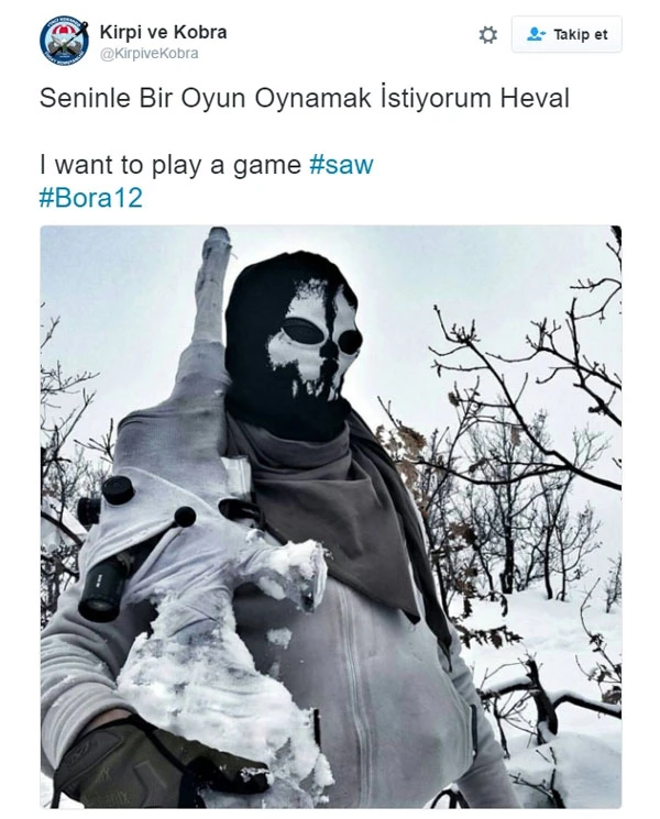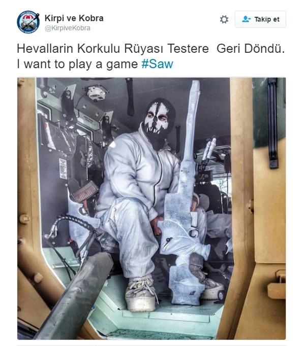 Twitter'da yaptığı paylaşımlarla dikkat çeken @KirpiveKobra hesabı dikkat çeken fotoğraflar paylaştı. Fotoğraflarda verilen mesajlar ise ayrıca dikkat çekti.Kamuflajı ile dikkat çeken keskin nişancı bir askerin fotoğraflarının paylaşıldığı hesaptan şu mesajlar verildi: Seninle Bir Oyun Oynamak İstiyorum Heval... Hevallerin Korkulu Rüyası Testere Geri Döndü. I want to play a game #Saw