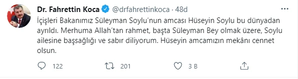 Sağlık Bakanı Fahrettin Koca, sosyal medya hesabında Süleyman Soylu'ya taziye mesajı yayınladı. Koca, İçişleri Bakanımız Süleyman Soylu’nun amcası Hüseyin Soylu bu dünyadan ayrıldı. Merhuma Allah’tan rahmet, başta Süleyman Bey olmak üzere, Soylu ailesine başsağlığı ve sabır diliyorum. Hüseyin amcamızın mekânı cennet olsun" ifadelerini kullandı.