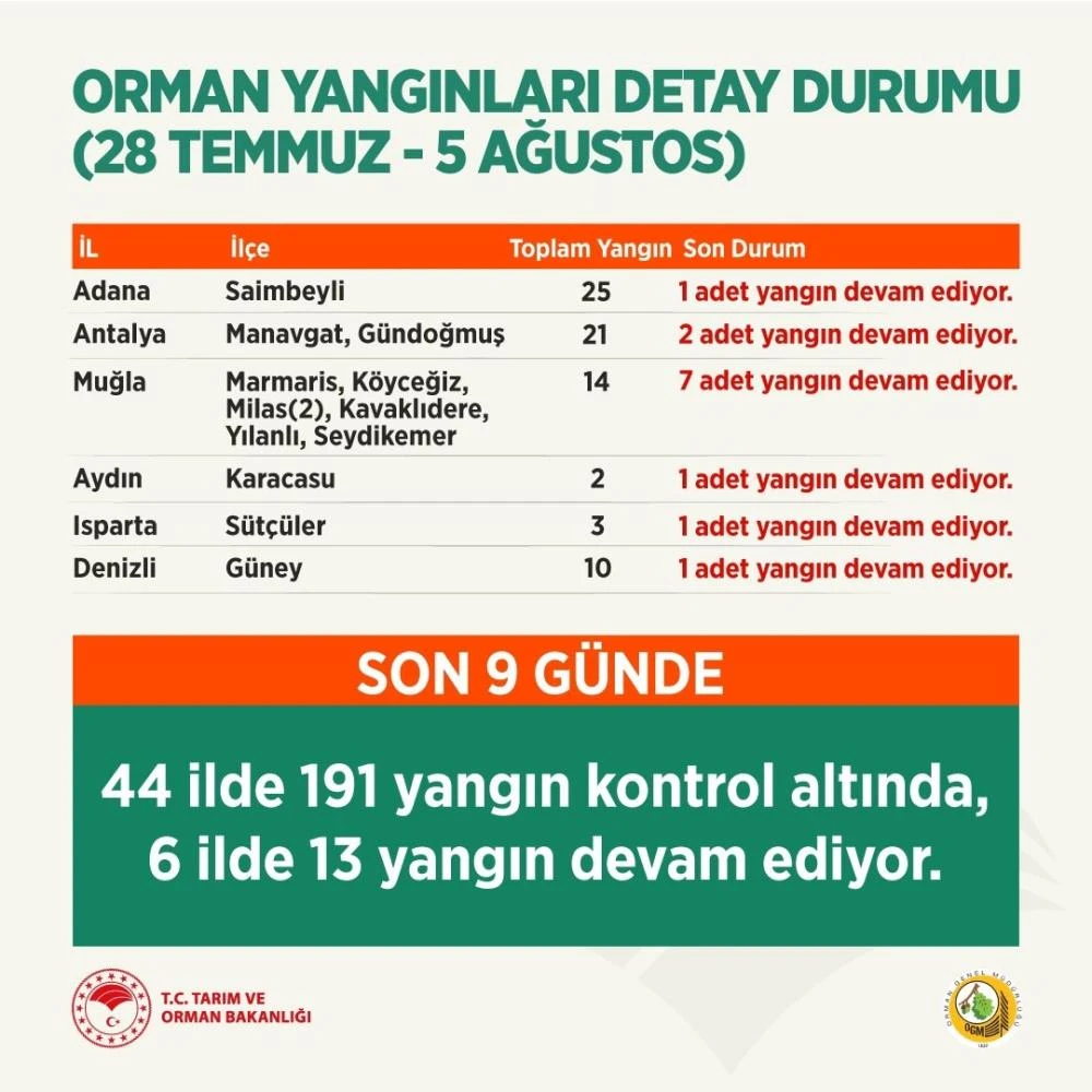 Bakan Pakdemirli, çıkan yangınlardan 191’inin kontrol altına alındığını, 13 yangını kontrol altına alma çalışmalarının devam ettiğini duyurdu. Pakdemirli, Antalya'da 21 yangından 2’si, Adana’da 25 yangından 1’i, Muğla’da 14 yangından 7’si, Isparta’da 3 yangından 1’i, Denizli 10 yangından 1’inin devam ettiği açıklamasında bulundu.