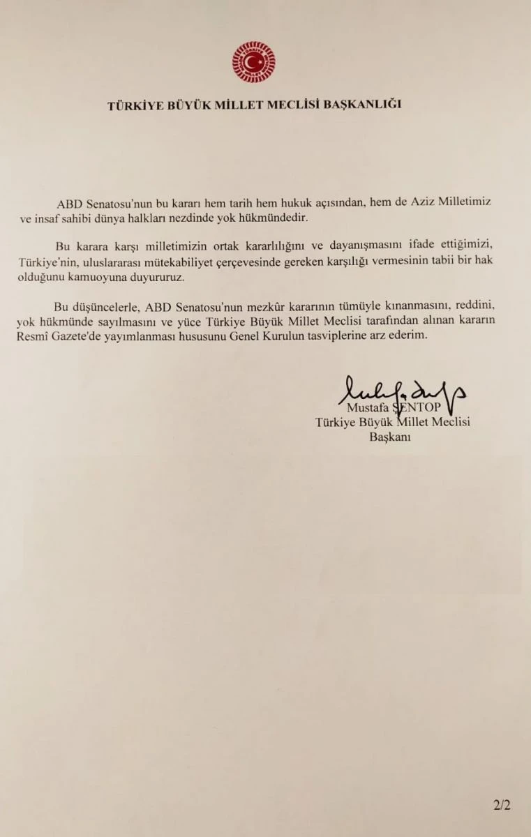 TBMM Genel Kurulunda AK Parti, CHP, MHP ve İYİ Parti grupları, ABD Senatosunun "Ermeni kararı"nı bildiriyle kınadı ve reddetti.