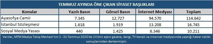 Medya Takip Merkezi (MTM), Temmuz ayında yaşanan siyasal ve toplumsal gelişmelerin nabzını tuttu. Yapılan incelemeye göre, 86 yıldır müze olarak hizmet veren Ayasofya’nın yeniden Cami olması, Temmuz ayı boyunca medyada en çok yer alan başlık oldu. Aylardır tartışmalara ve fikir ayrılıklarına neden olan İstanbul Sözleşmesi ve yeni sosyal medya yasası da gündemden düşmeyen diğer başlıklar arasındaydı.