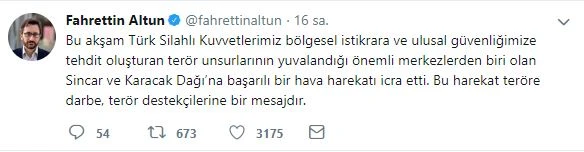 Harekâtla ilgili twitter'dan paylaşım yapan Cumhurbaşkanlığı İletişim Başkanı Fahrettin Altun, "Bu harekât teröre darbe, terör destekçilerine bir mesajdır" dedi.