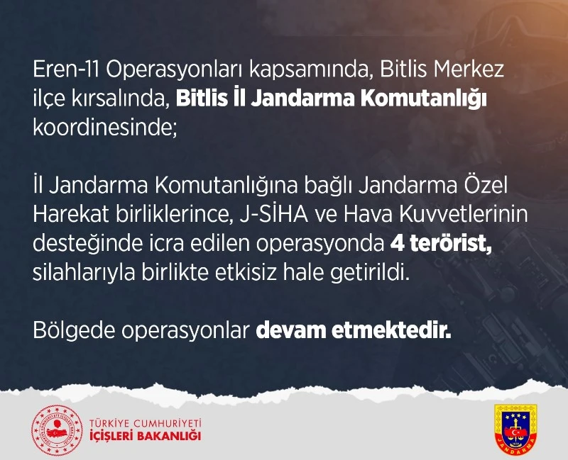 İçişleri Bakanlığının resmi Twitter hesabından yapılan paylaşımda, Eren-11 operasyonları kapsamında 4 teröristin daha etkisiz hale getirildiği duyuruldu. Operasyonun Bitlis'in Merkez ilçe kırsalında, Jandarma Komutanlığı koordinesiyle gerçekleştirildiği ifade edildi.