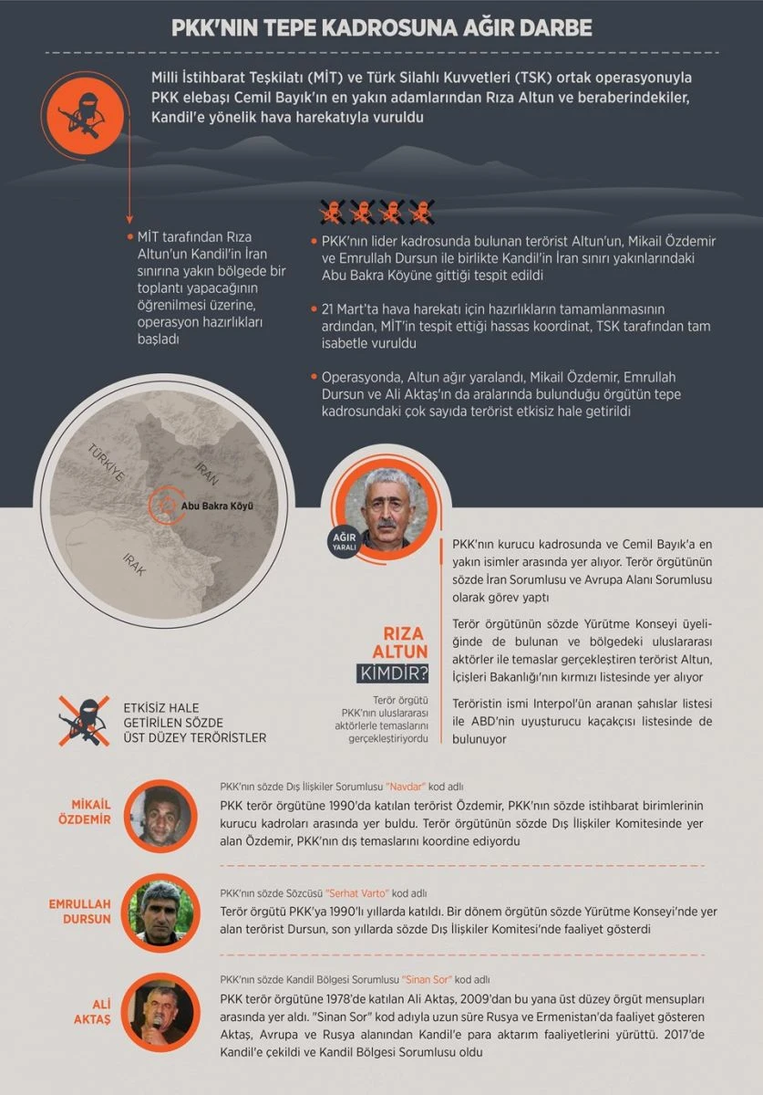Güvenlik güçlerinden alınan bilgiye göre, Milli İstihbarat Teşkilatı (MİT) ve Türk Silahlı Kuvvetleri (TSK) tarafından yürütülen ortak operasyonda, 21 Mart Perşembe günü, PKK elebaşı Cemil Bayık'ın en yakın adamlarından olan Rıza Altun ve beraberindeki isimler, Kandil'e yönelik hava harekatı neticesinde etkisiz hale getirildi.