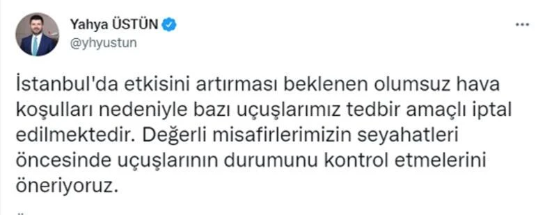Türk Hava Yolları Basın Müşaviri Yahya Üstün, İstanbul'da etkili olan kar yağışı nedeniyle hatırlatmada bulundu. Üstün Twitter'dan yaptığı açıklamada, "İstanbul'da etkisini artırması beklenen olumsuz hava koşulları nedeniyle bazı uçuşlarımız tedbir amaçlı iptal edilmektedir. Değerli misafirlerimizin seyahatleri öncesinde uçuşlarının durumunu kontrol etmelerini öneriyoruz." ifadelerini kullandı.