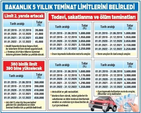 Hazine ve Maliye Bakanlığı imzaladığı yönetmelikle trafik sigortalarında 5 yıllık teminat limitlerini belirledi. Trafik sigortasında, bir kaza durumunda sigorta şirketlerinin ödeyeceği en fazla tazminat tutarını gösteren limitlerdeki yenileme sonrası maddi hasarlı kazalarda 36 bin TL olan araç başına limit, 1 Temmuz 2019'a kadar devam edecek. Yılın ikinci yarısında limitlerde 3 bin liralık artış yaşanacak.
